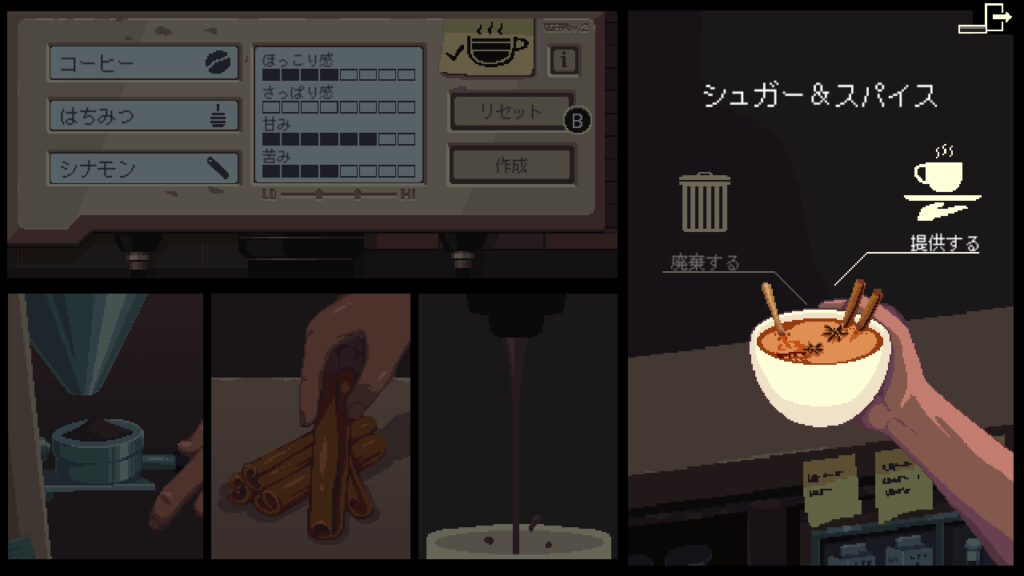この時点でネームドのレシピもほぼ揃った状態になってたので、3周目では改めてお客さんの要望に合った飲み物を出して、全キャラのストーリーを見届けて終わった。