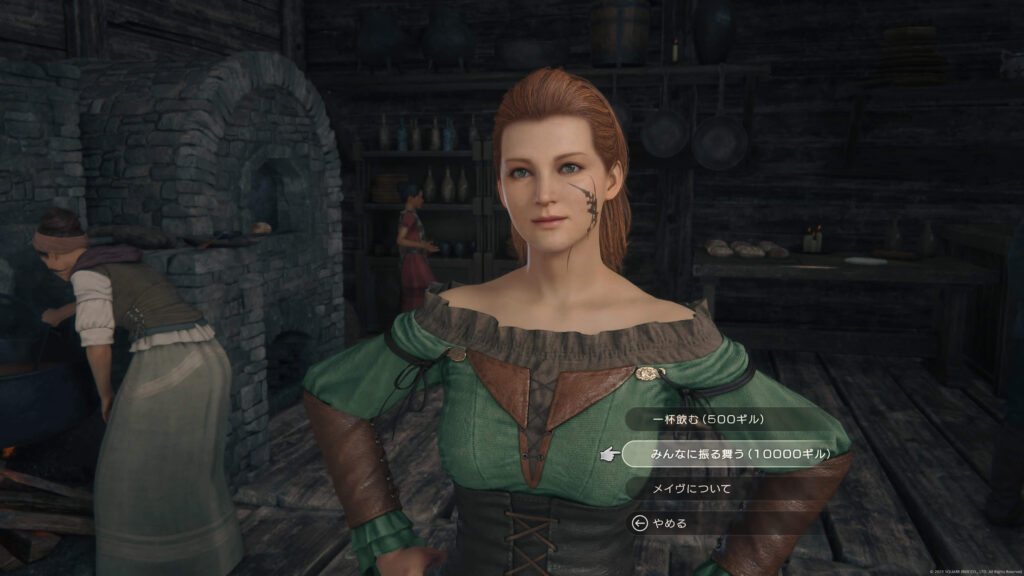 酒場では自分で飲むか、10000ギルで仲間に振る舞うか選べる。