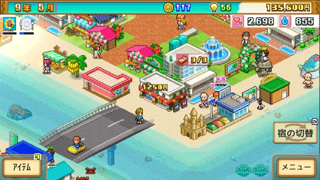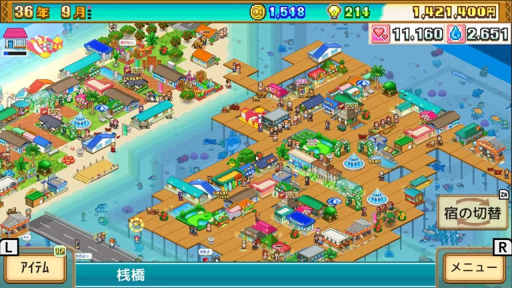 最終的には海のど真ん中に桟橋で施設建てるスペースを作って水上コテージを建て、コテージのエリアの中にとにかくスポットが発生する組み合わせの施設を敷き詰めて観光客からの評価を上げまくった。